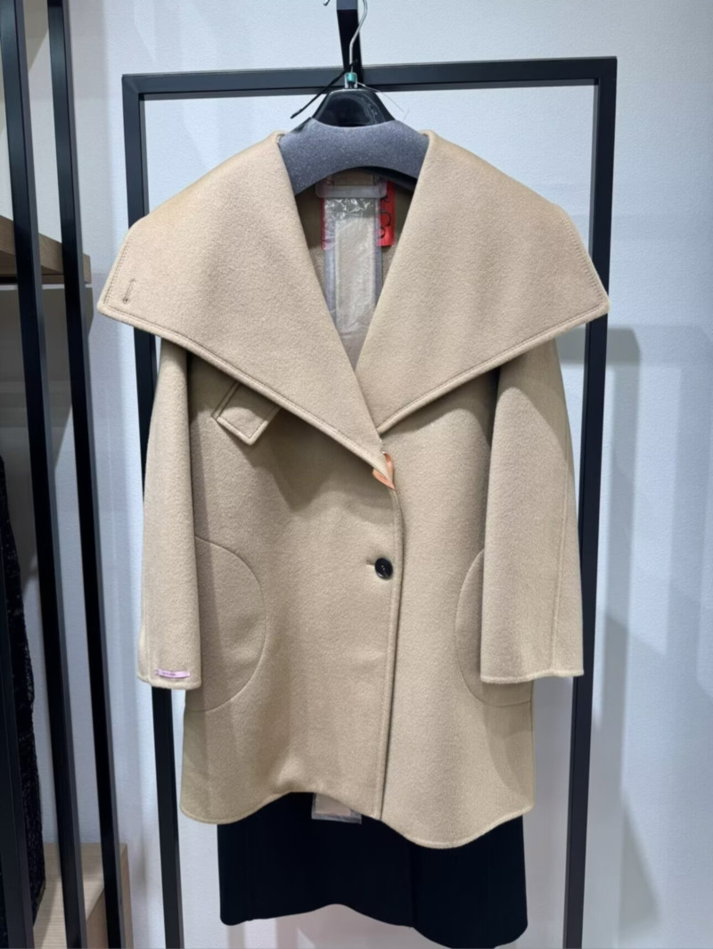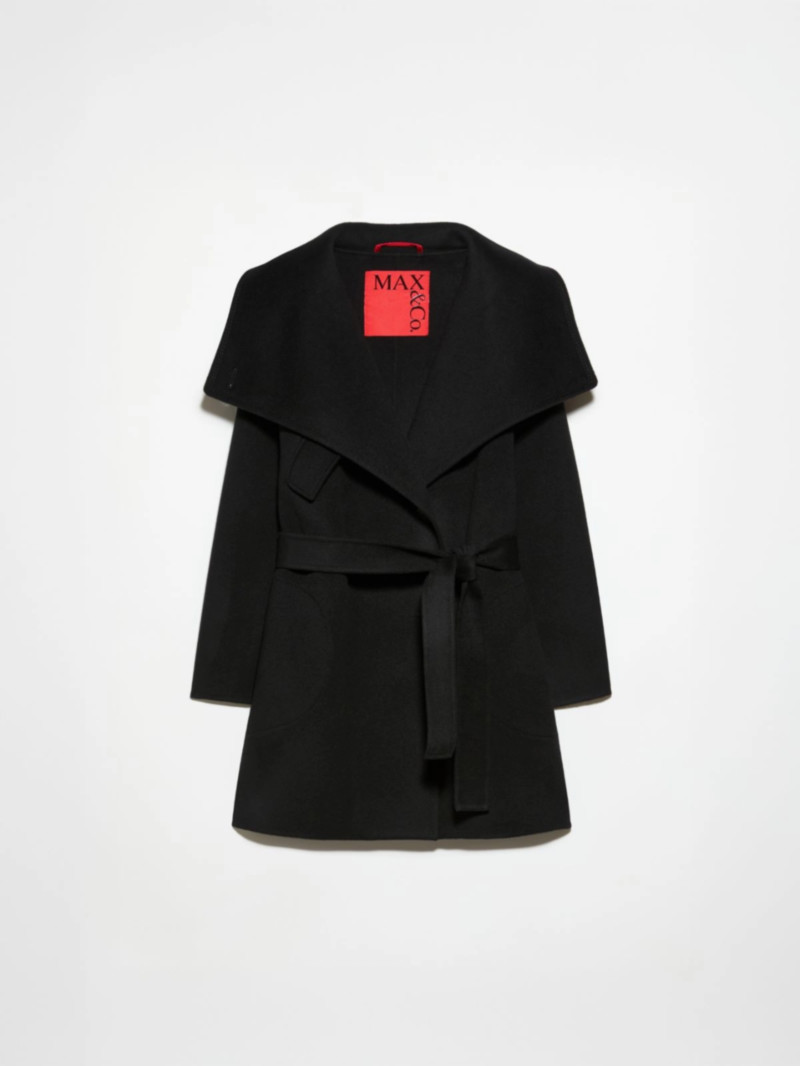 純雙層羊毛,手工縫製接縫。 高領,落肩設計,正面設有貼邊口袋和插袋。 後開衩,附同色腰帶,可繫於腰間。