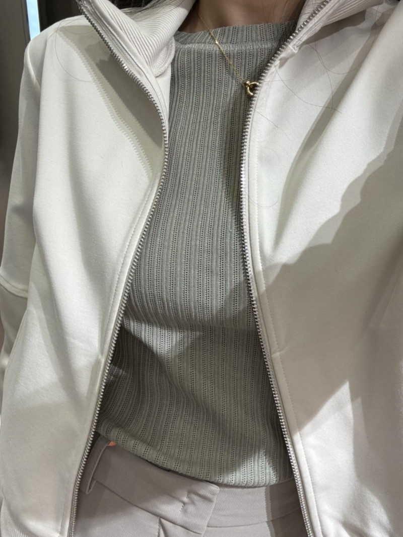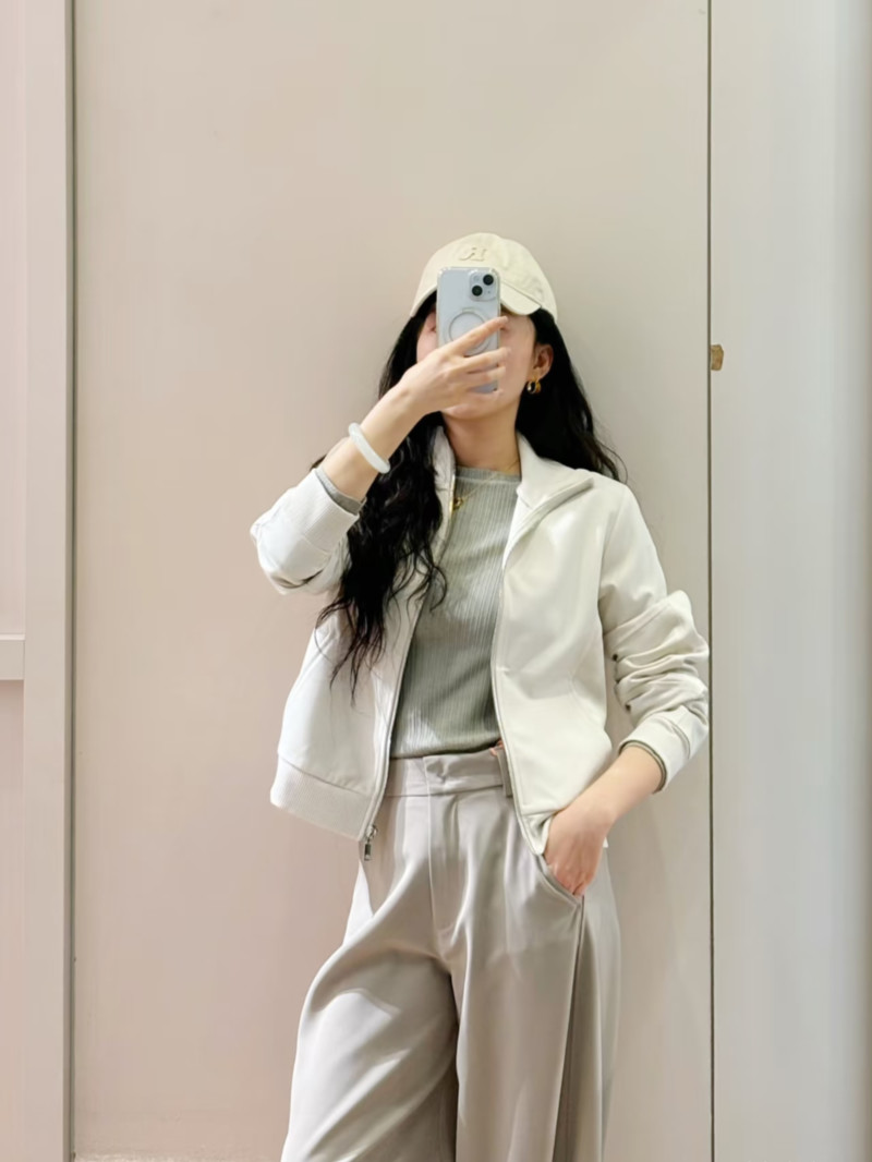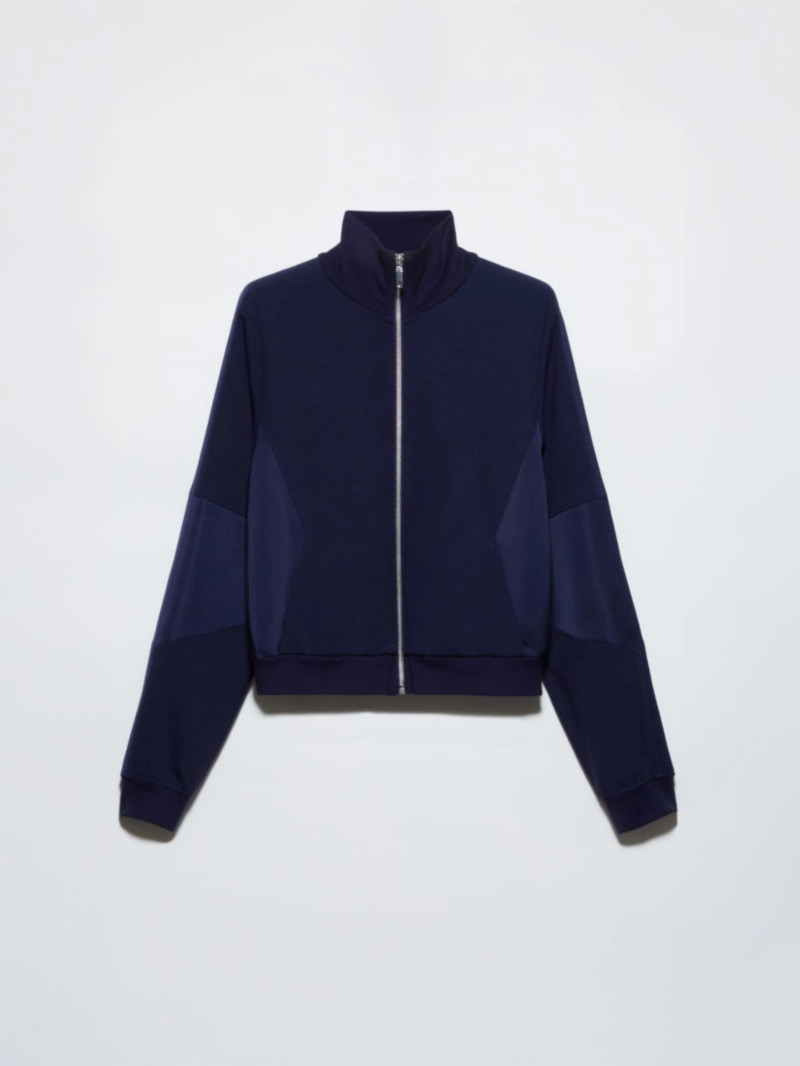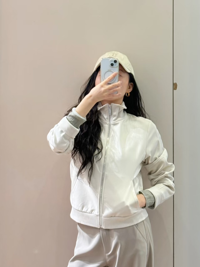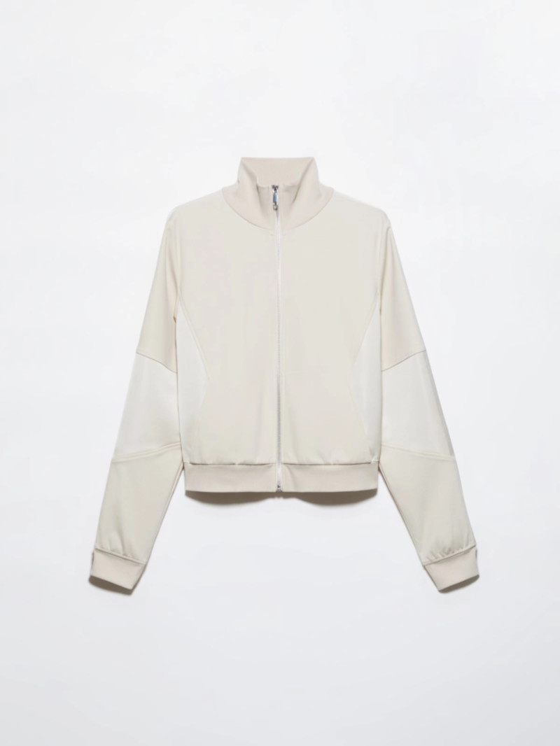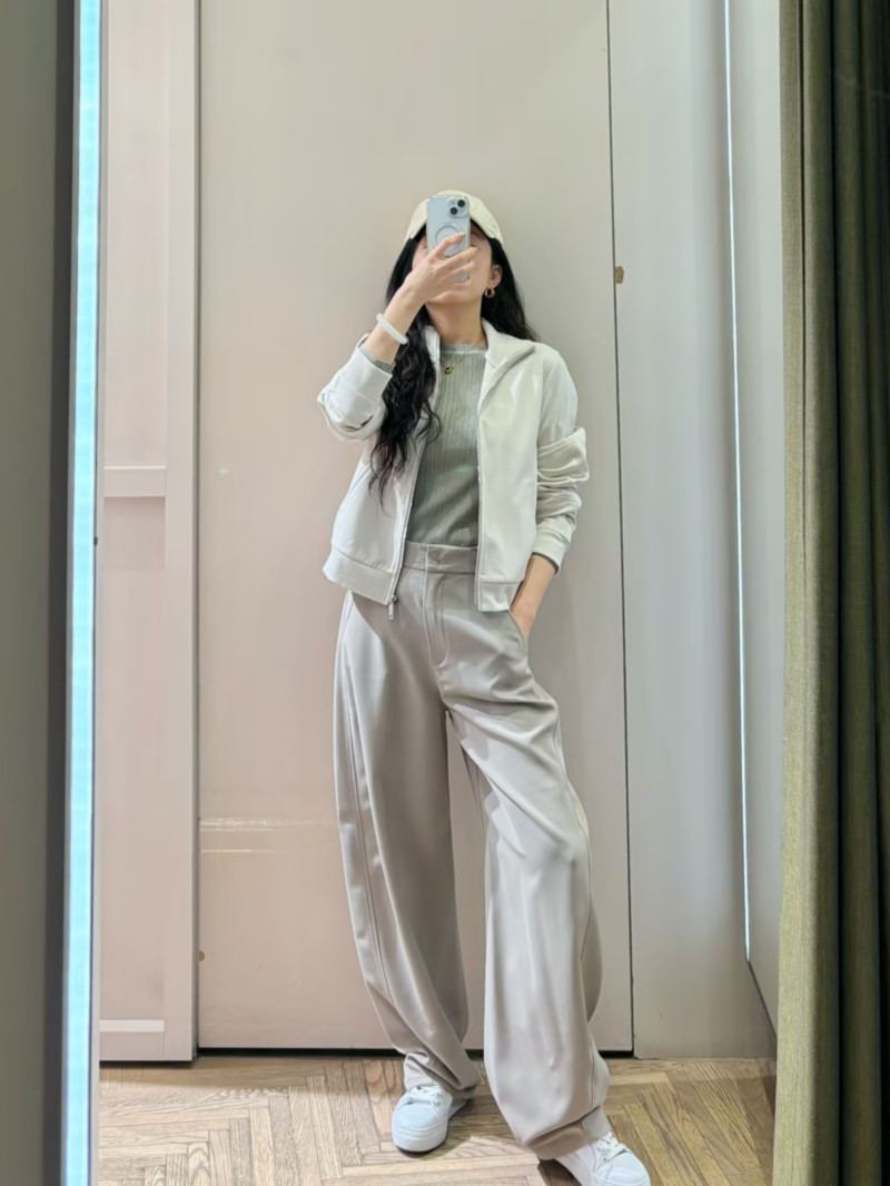 高級運動休閒風格:這款採用科技針織布料和緞面拼接的嵌花夾克,既可作為運動套裝的一部分,也可單獨搭配修身長褲穿著。