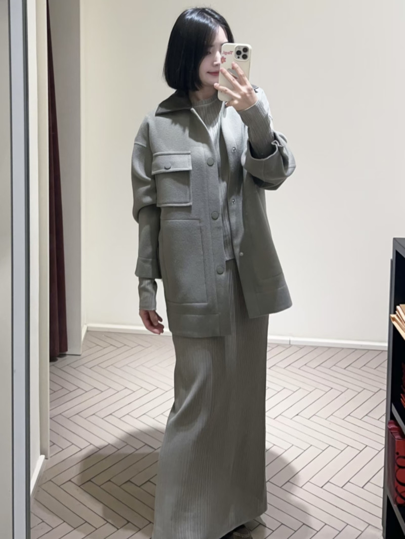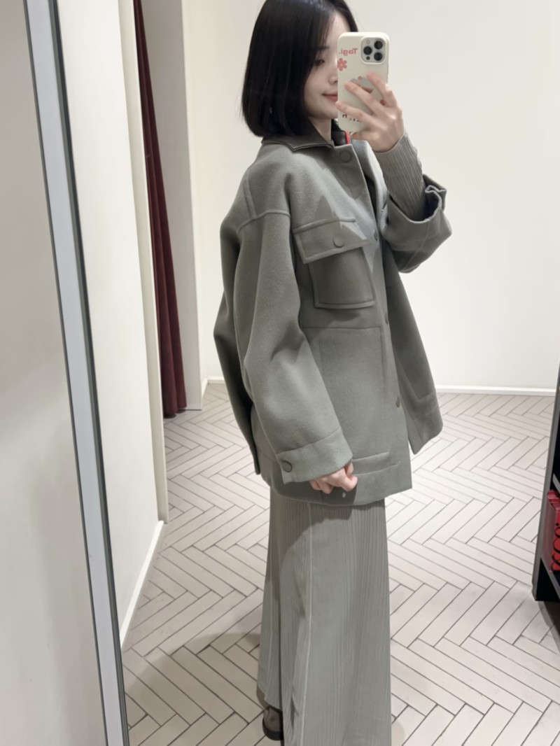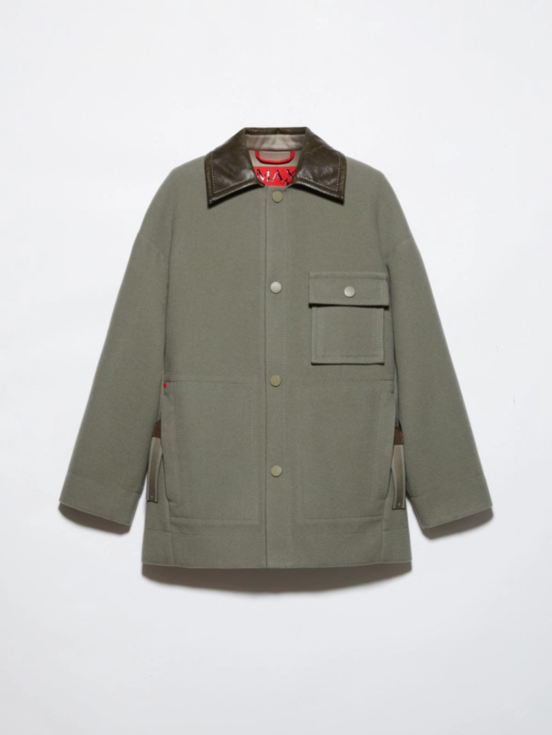 雙層純羊毛織物,手工縫製接縫。 皮革襯衫領,領底飾以撞色刺繡標誌。 落肩設計,袖口和下擺後側飾有褶襉。 側邊貼袋,拉鍊插袋,皮革拉鍊頭和飾有橡膠細節的緞帶。 同色漆面按扣,寬鬆版型。 主體布料至少含50% 源自永續動物養殖的纖維。