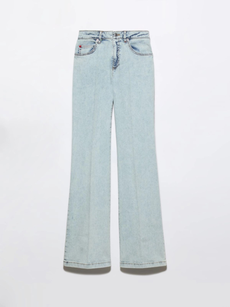 彈性棉質牛仔布,淺色水洗,呈現復古效果。 微喇叭褲管,常規腰身,附腰帶環。 五口袋設計,隱形拉鍊與紐扣門襟,後腰飾有MAX&Co.標誌皮革標籤。