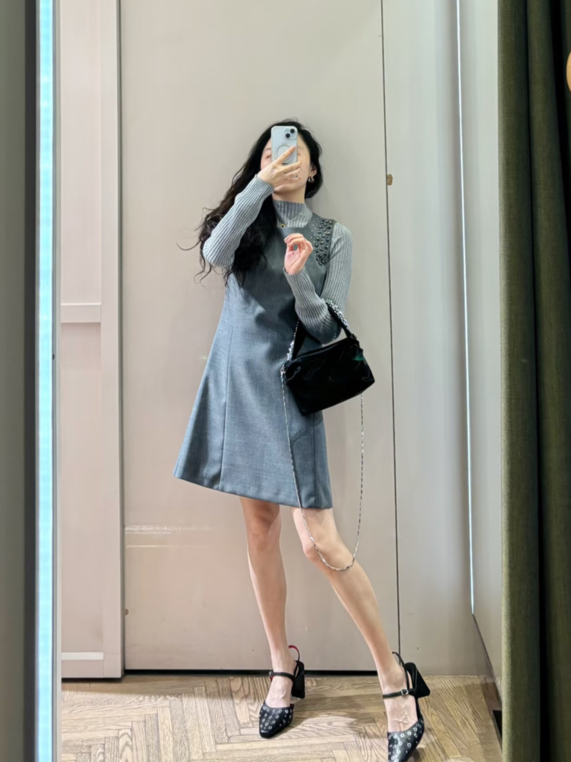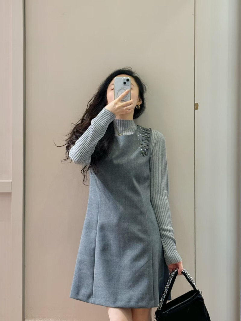 灰綠色羊毛混紡,正面飾有刺繡水鑽和微型鉚釘。 圓領,無袖,後背隱形拉鍊。 部分襯裡,修身版型。