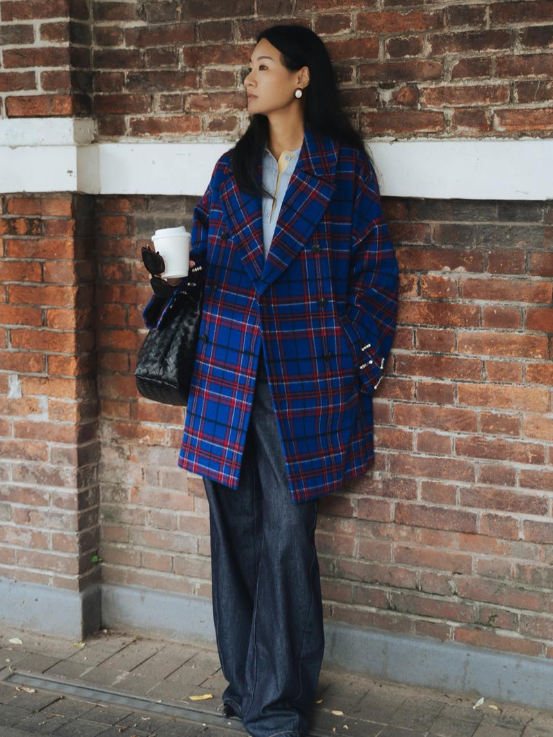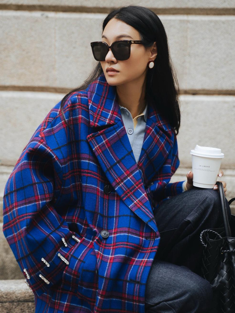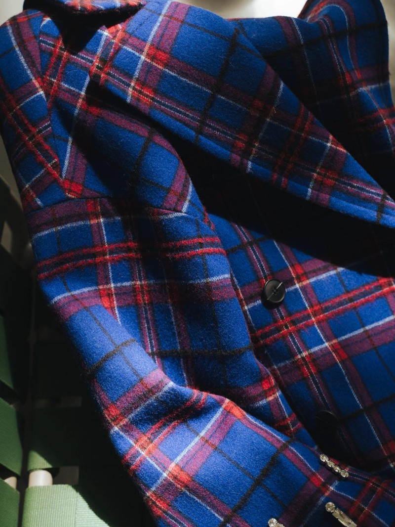 風格融合:這款超大雙排扣羊毛大衣以出人意料的亮麗色彩和閃亮刺繡點綴傳統的蘇格蘭格子呢。 紗線染色羊毛混紡,雙排扣設計,略微蝙蝠袖的輪廓。 袖口飾有水鑽刺繡,正面貼邊口袋,寬鬆版型,有內襯。 可搭同系列迷你裙。