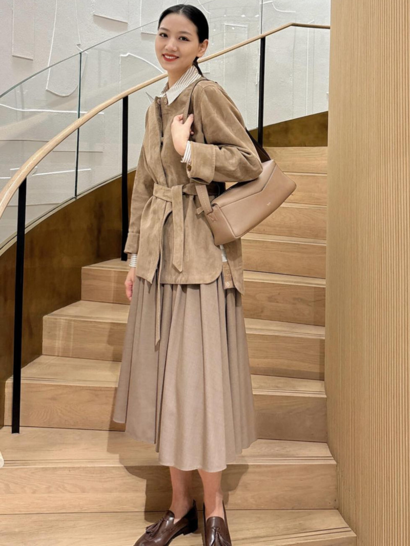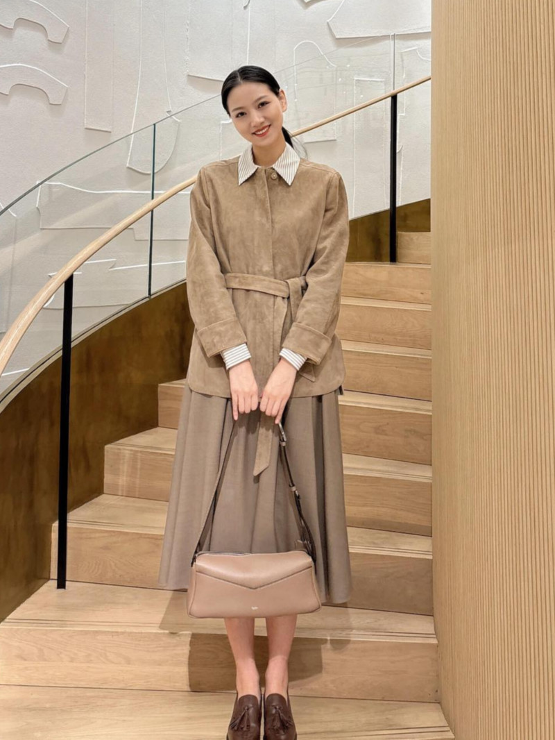 圓領夾克,搭配同色腰帶,凸顯腰線。 麂皮,直筒版型。 插肩袖,袖口開衩。 前襟四顆隱形按扣,側邊圓弧形開衩,後擺略長。