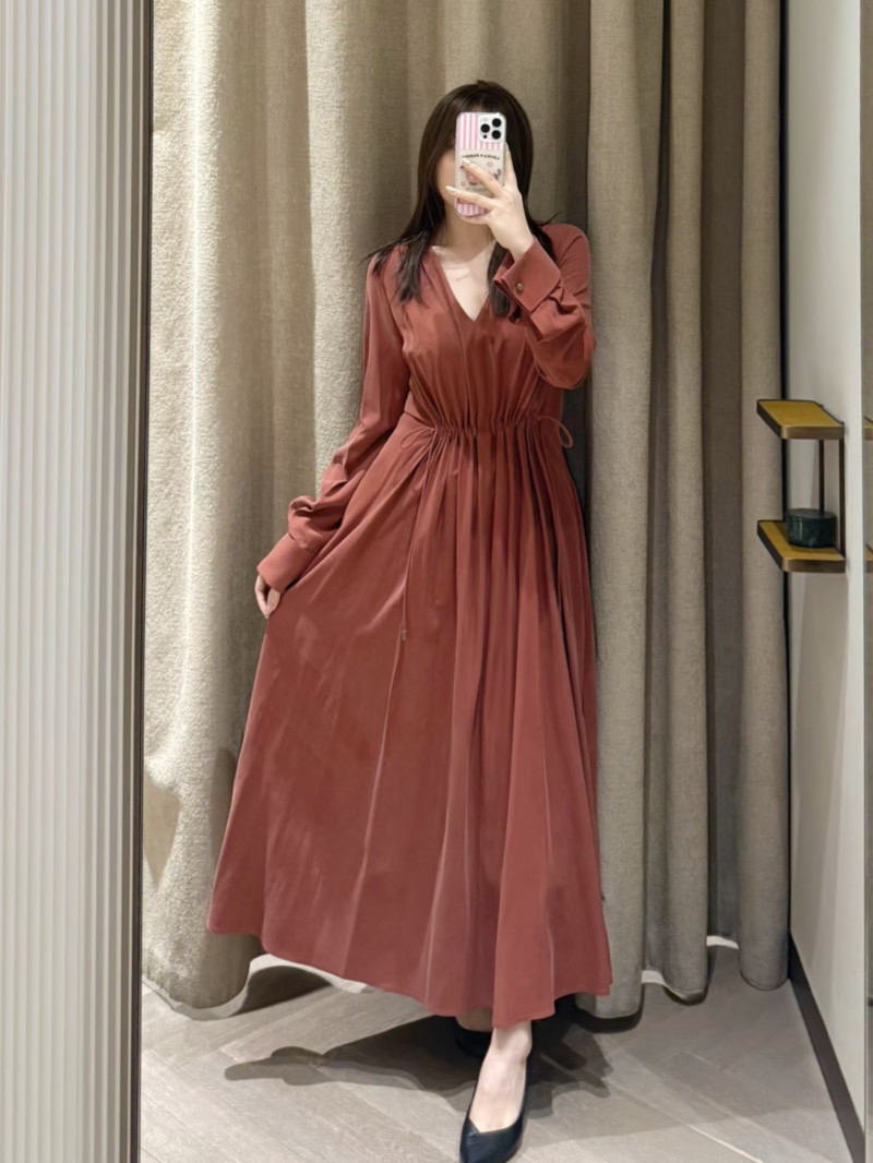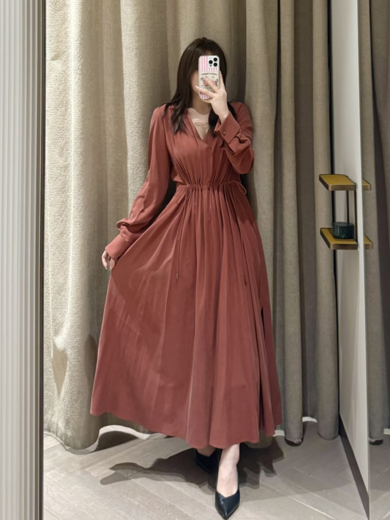 長連身裙,前後均配有可調式抽繩腰帶,凸顯曼妙身姿。 修身剪裁,裙子呈喇叭形。 V領長袖,肩膀略為蓬鬆,後背隱形拉鍊。 側邊插袋,袖口飾有高領袖扣,裙擺兩側開衩。