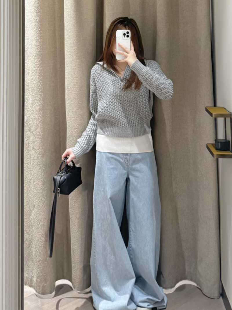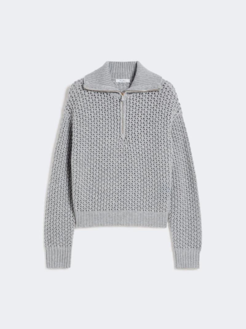 網眼針織短版毛衣,羊毛羊絨混紡,飾以金銀絲線。 寬鬆版型,高領Polo領,搭配金屬拉鍊和皮革拉鍊頭。 長款低領袖,羅紋邊飾,直筒下擺。