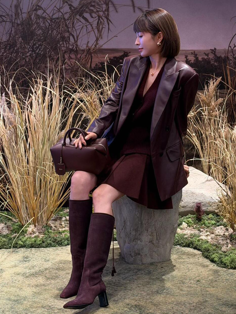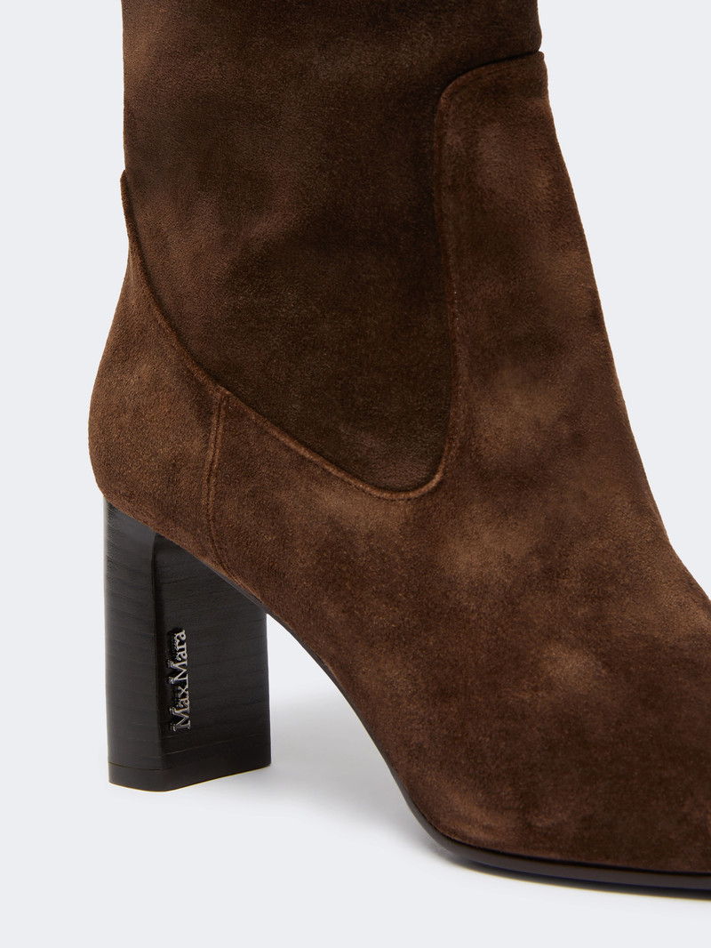 絨面小牛皮高筒靴,後跟閉合,配有蠟質管狀鞋帶,底部飾有流蘇。 納帕皮革襯裡,方頭。 7.5公分粗跟,飾有金屬字母標誌。 拋光皮革鞋底,飾有防滑Monogram字母細節。