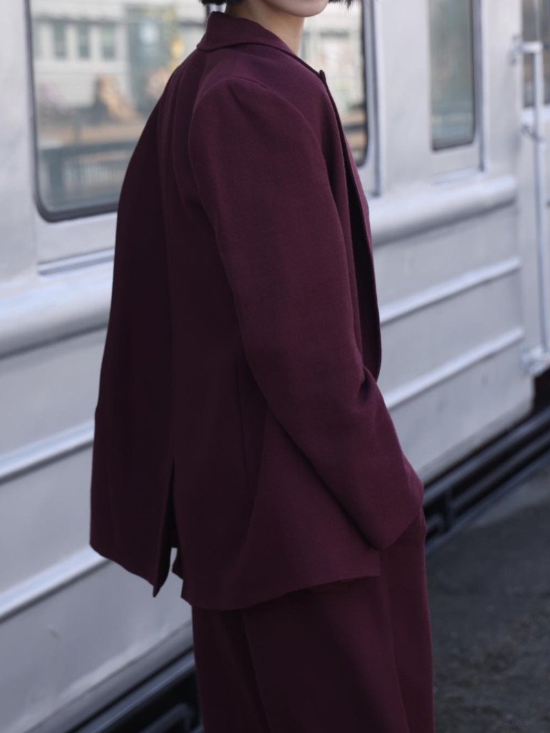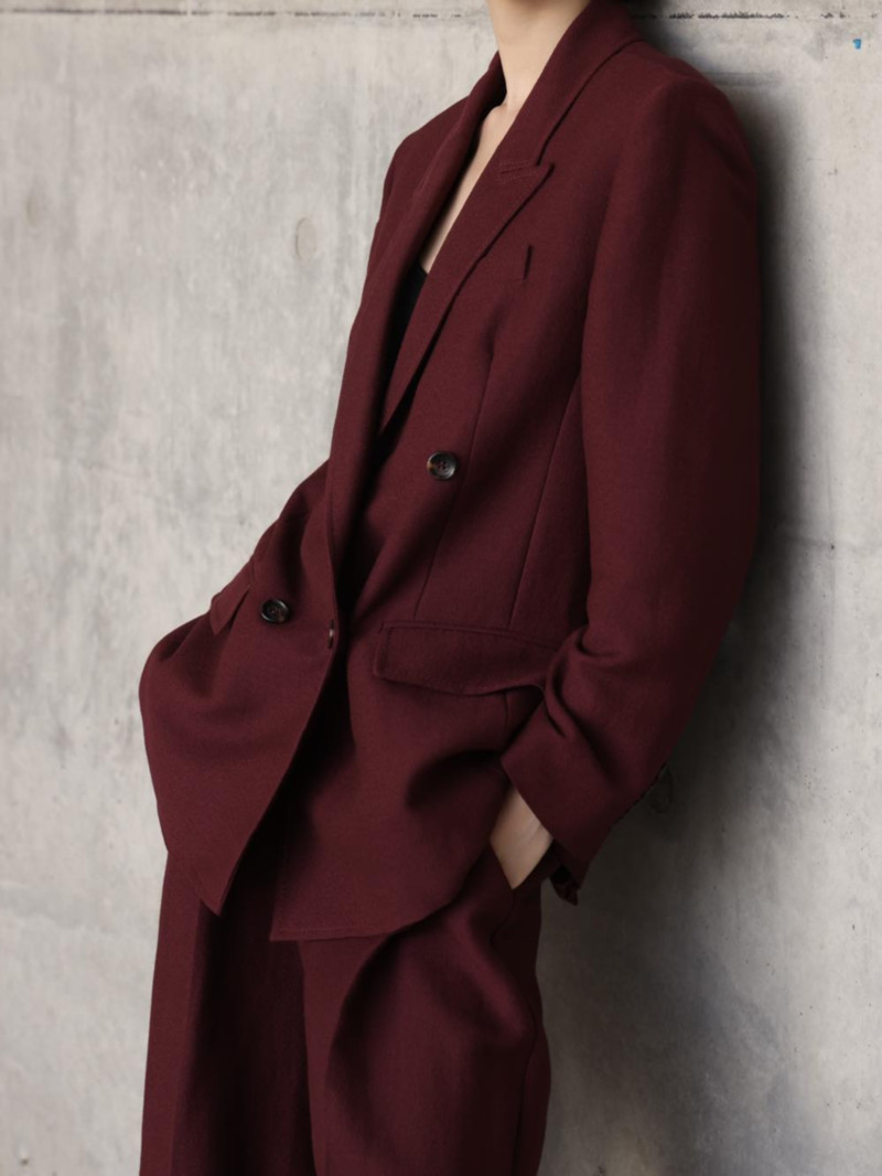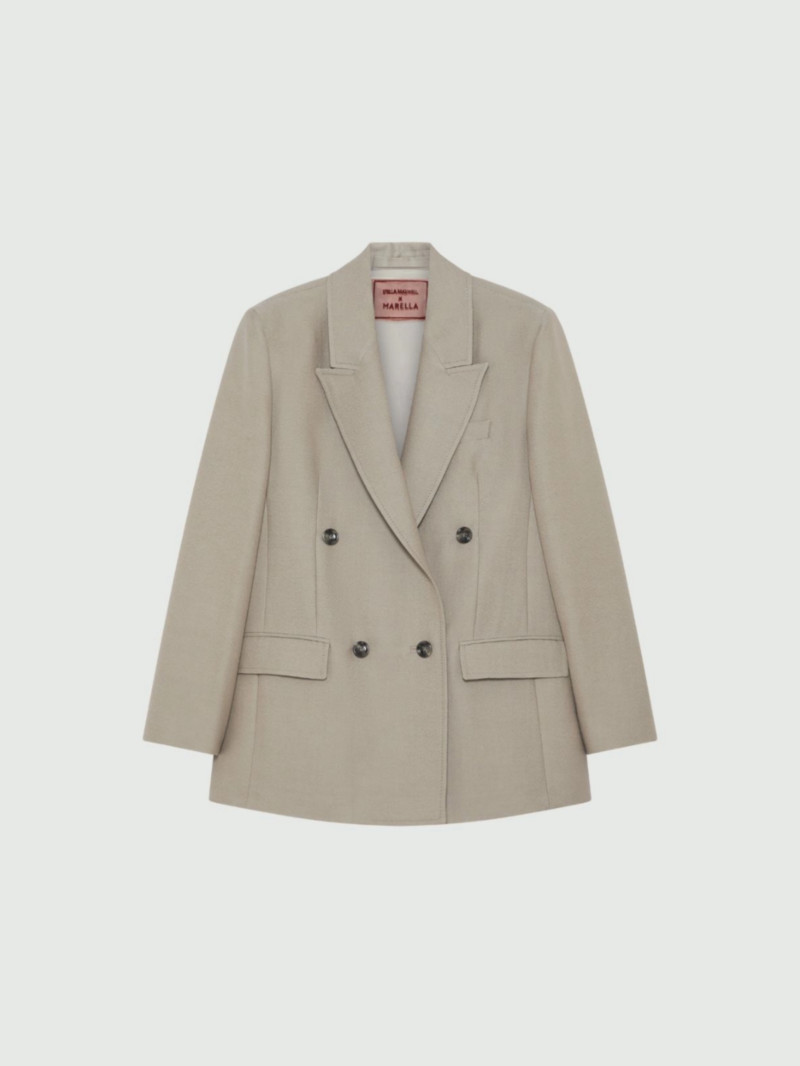 融合優雅的薩布雷布料與西裝外套的酷感細節,打造全新寬鬆隨性的輪廓。 搭配同款長褲,展現精緻幹練的商務風格。來自 Marella 與 Stella Maxwell 聯名推出的特別 Codesign 系列。 寬鬆廓形,寬戧駁領。 雙排扣設計,紐扣外露,個性化提花襯裡。