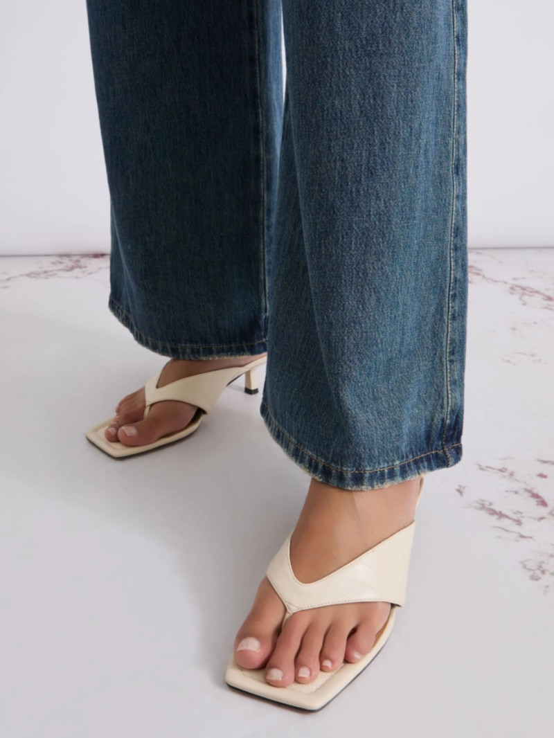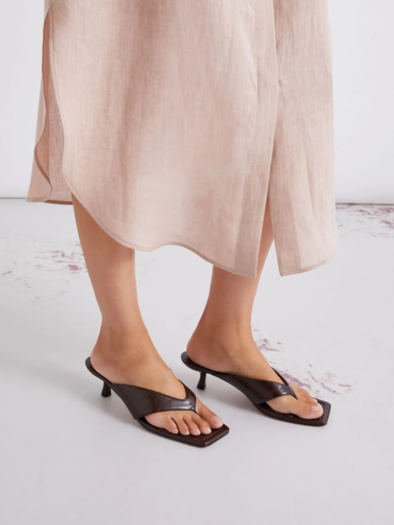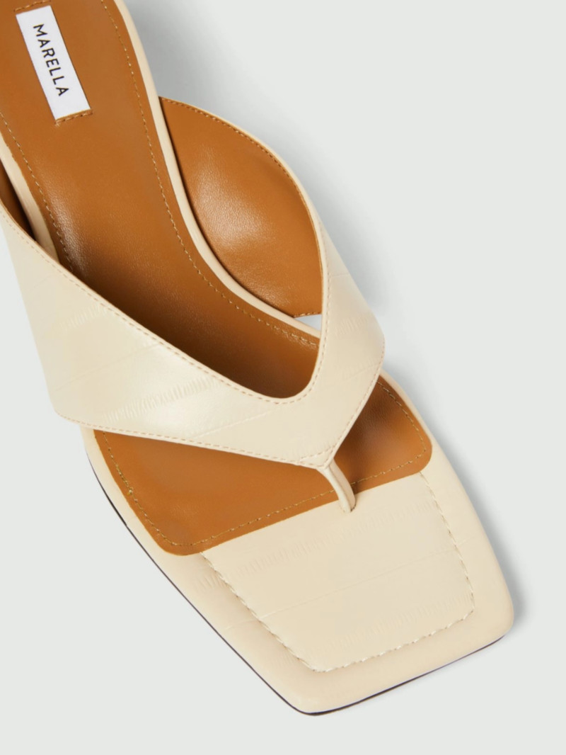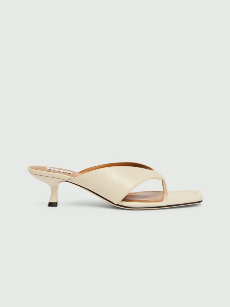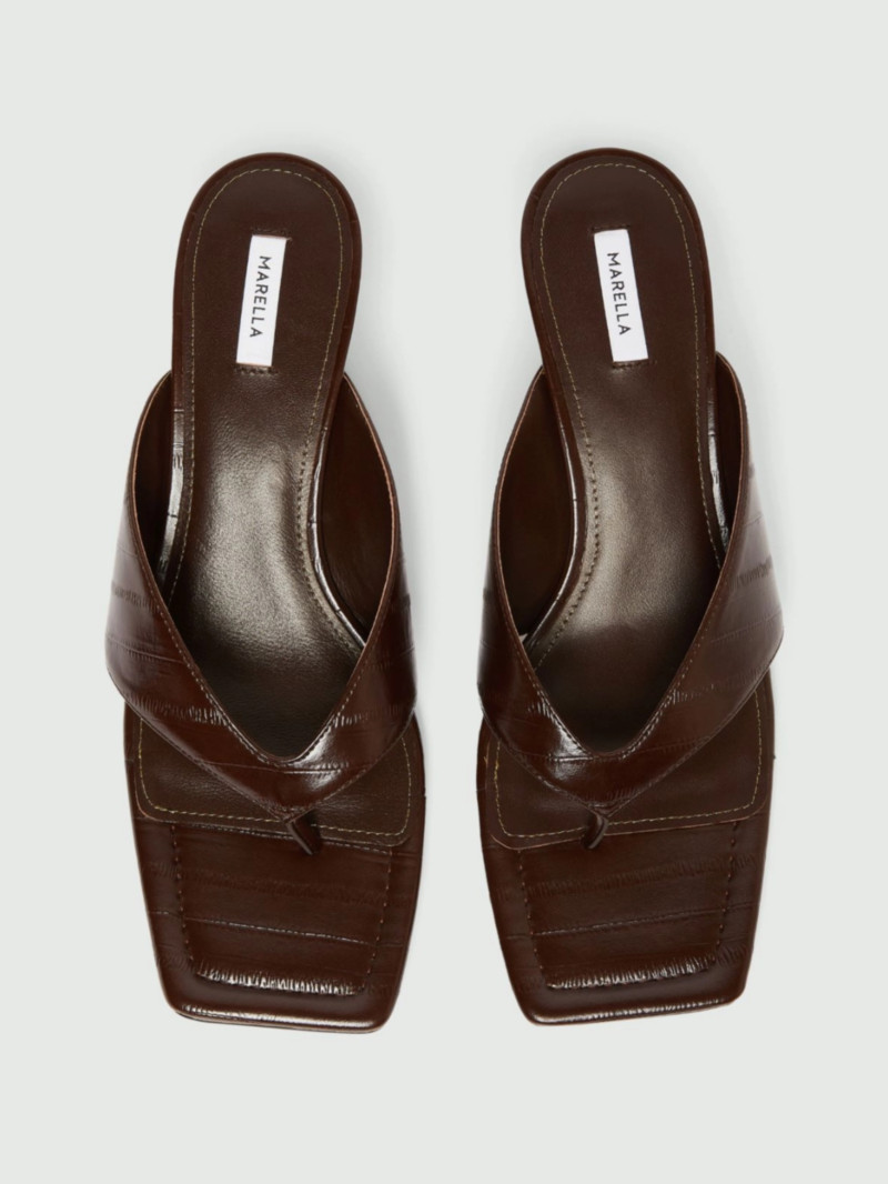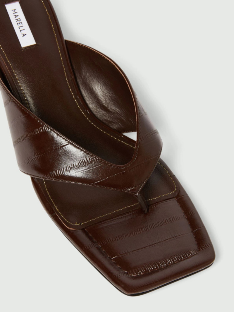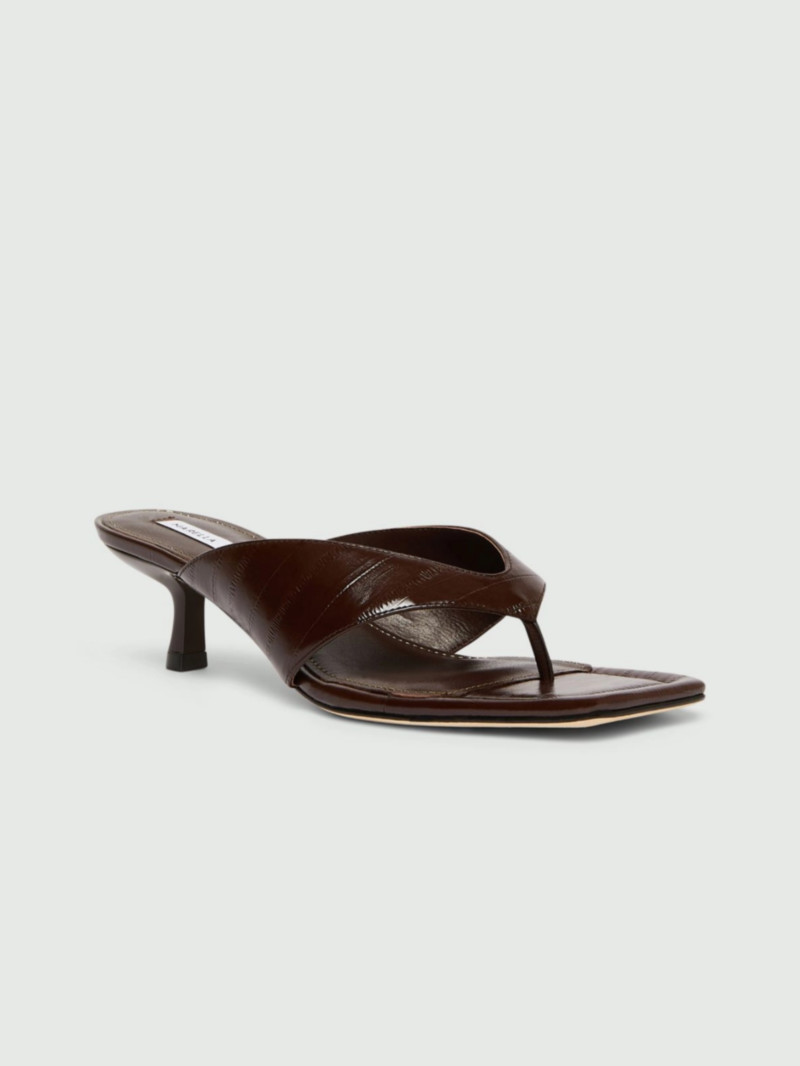 優雅方頭設計。鞋跟略高。 人字涼鞋飾以壓紋印花,纖細的同色漆皮鞋跟,高4cm。 山羊皮革內襯和鞋墊,天然磨砂皮革鞋底。
