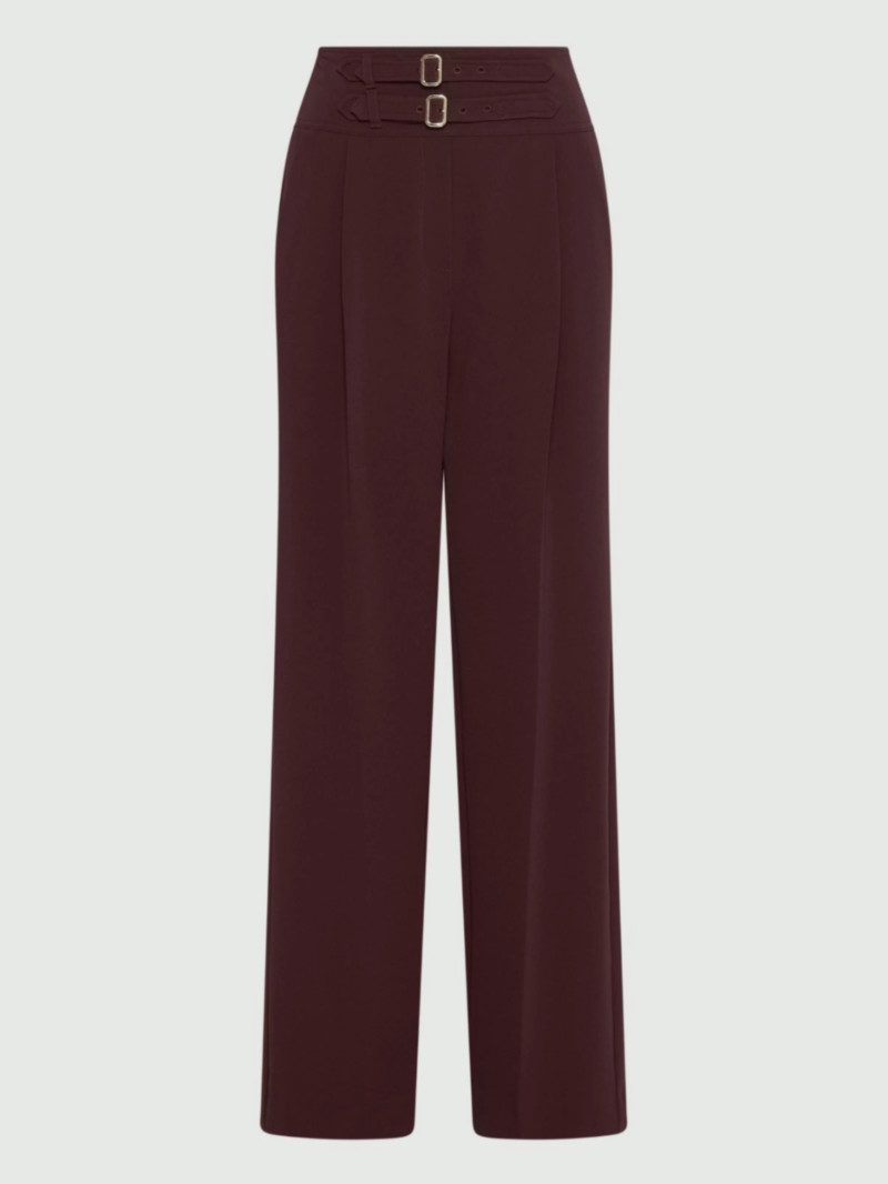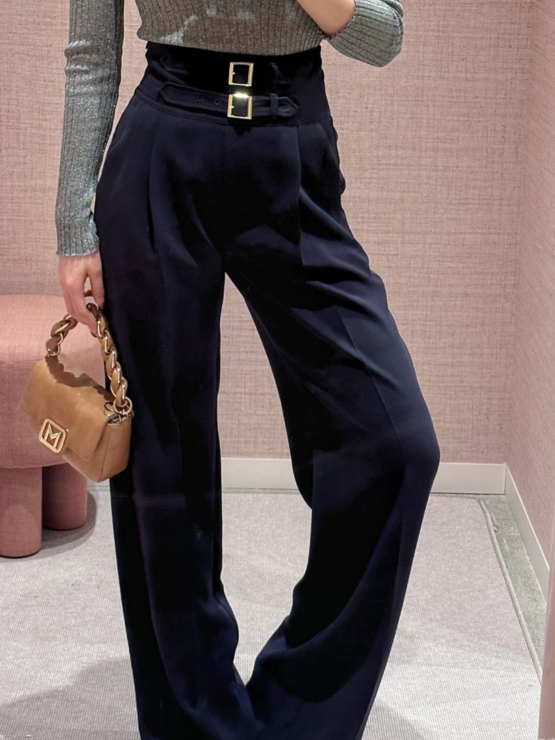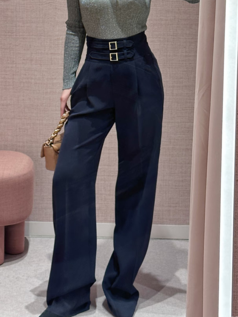 高腰設計,附腰帶和扣。 柔軟褲管,側邊隱形拉鍊。 後腰彈性拼接設計,側斜插口袋和後貼袋。