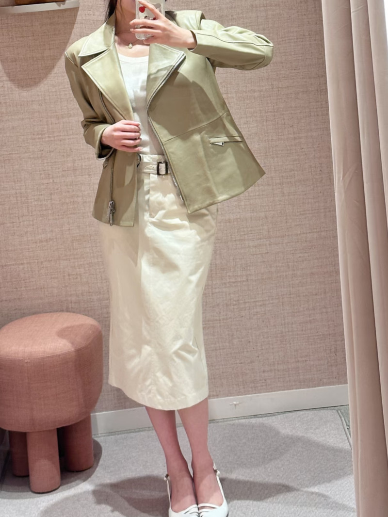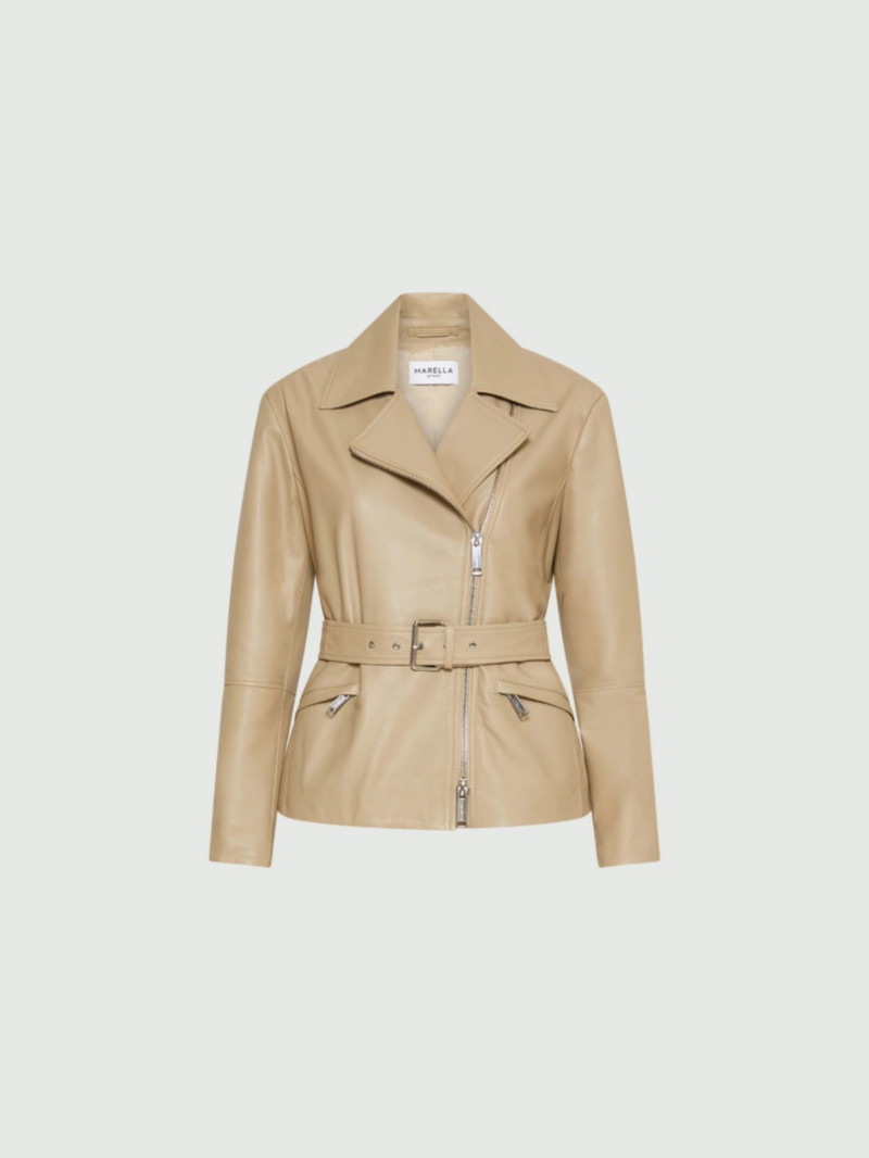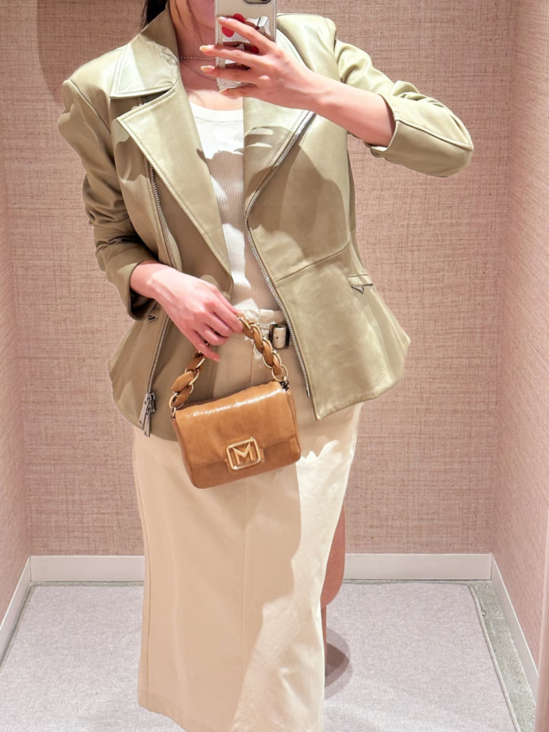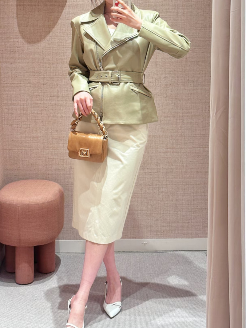 這款納帕皮機車夾克風格大膽,街頭感十足,採用醒目的廓形設計,並以金屬拉鍊點綴開口和口袋。腰帶設計更凸顯腰部線條。