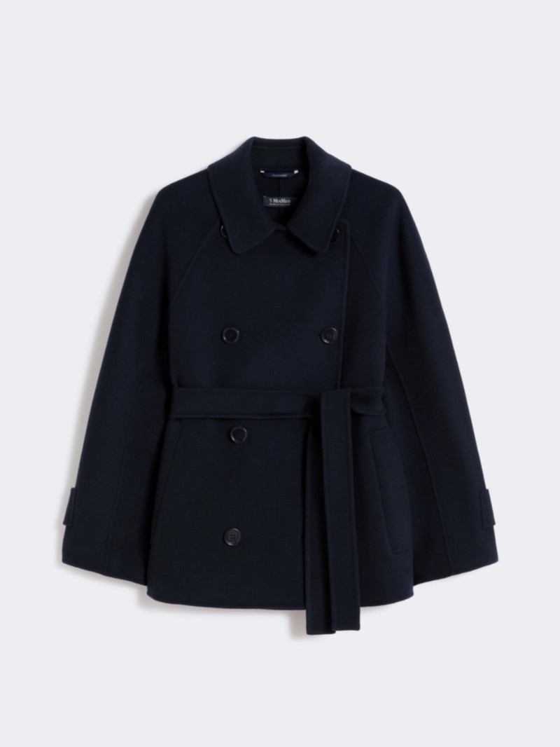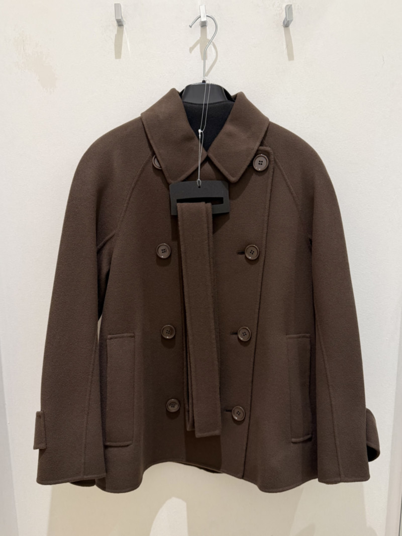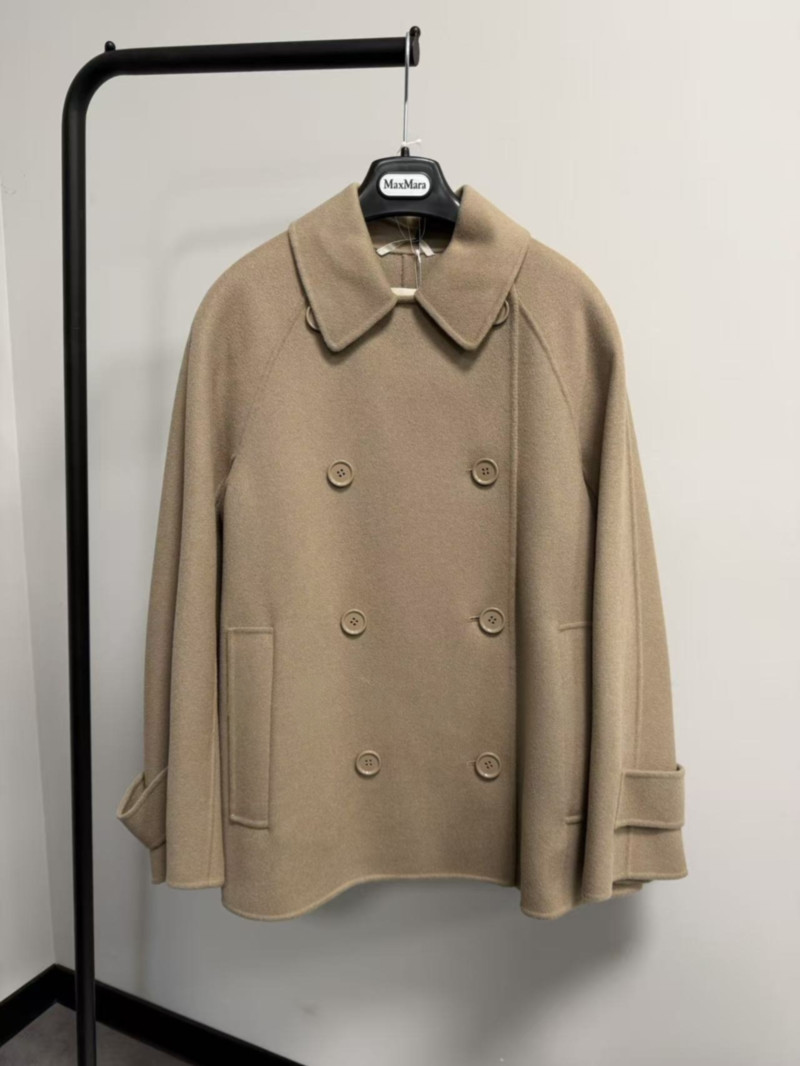 短版雙排扣大衣,腰間配有同色腰帶。 雙層垂褶純羊毛大衣,寬鬆版型,後中開衩。襯衫領,可作兩用領。 插肩袖,袖口配有調節扣和扣。 前襟紐扣,側邊貼袋。