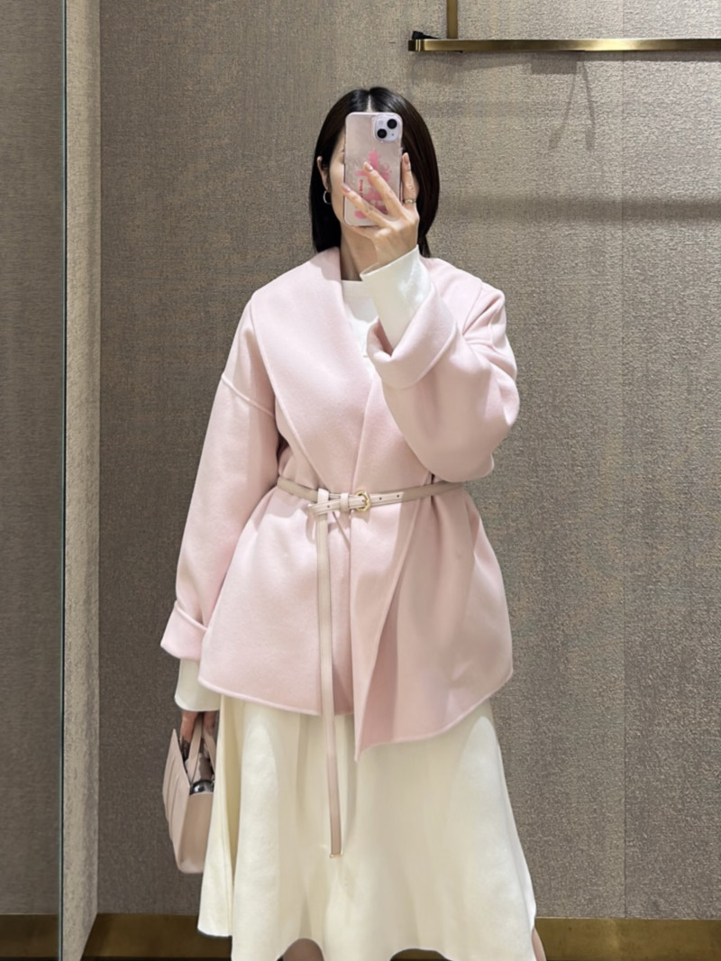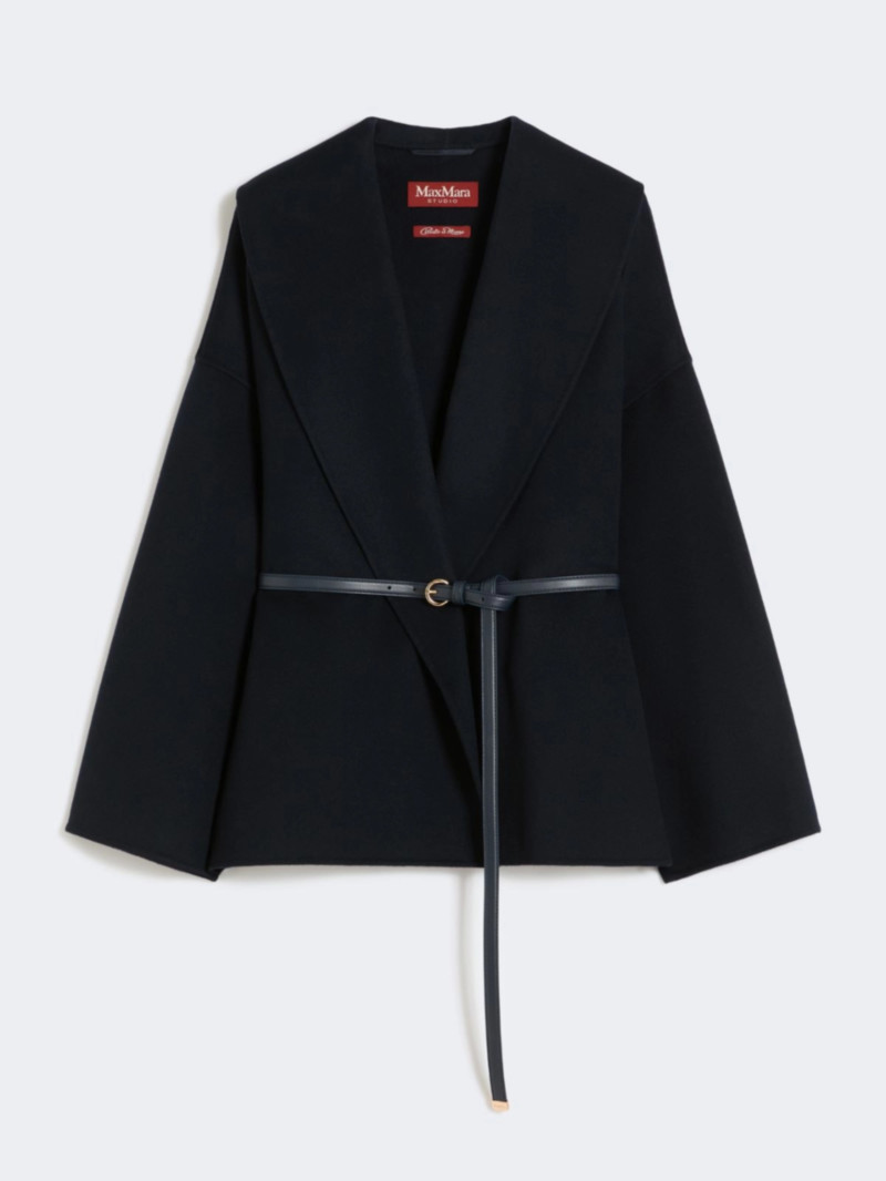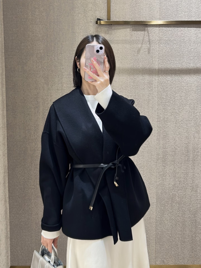 短版大衣,配有同色腰帶,凸顯腰線。 手工縫製雙層垂褶羊毛、羊絨和絲質混紡大衣。 裹身式剪裁,寬披肩領。 長款低領袖,腰帶式閉合,側插袋。