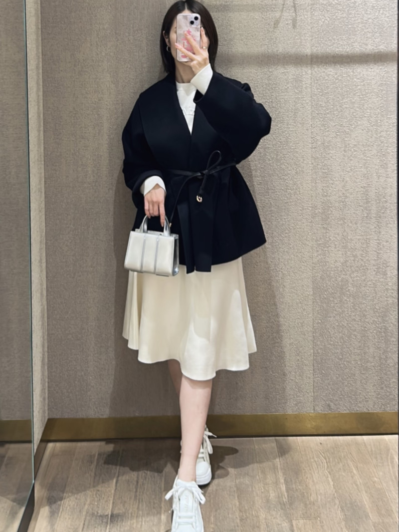 外套材質為 88% 初剪羊毛、6% 真絲、6% 羊絨;不含包邊線;配有聚氨酯塗層聚酯腰帶。