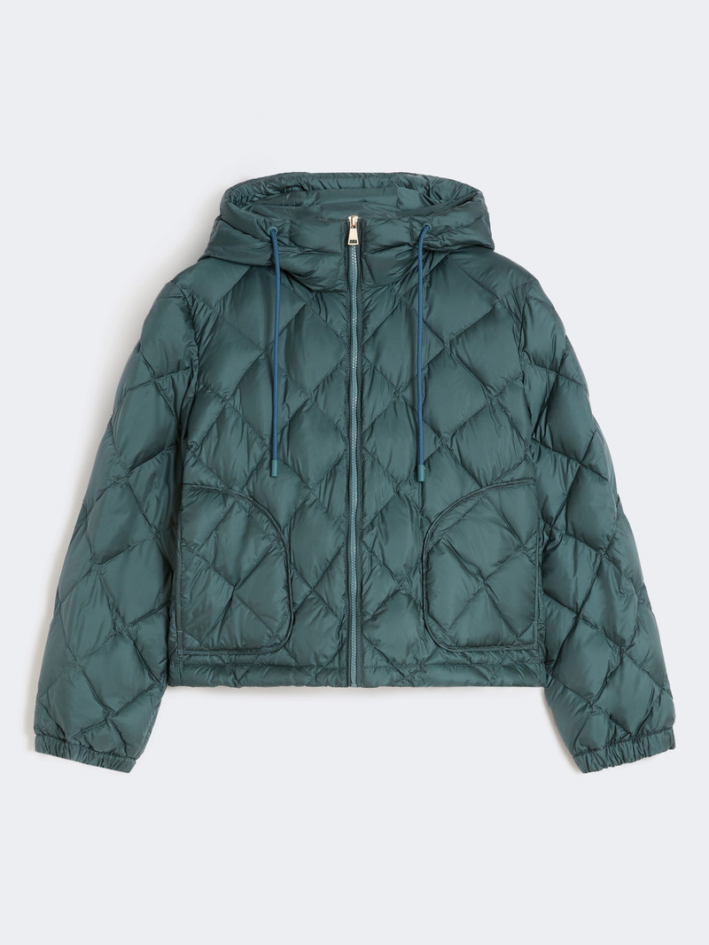 短版羽絨服,附抽繩兜帽和菱形絎縫圖案。 防水科技布料外套,寬鬆版型。 插肩袖,袖口有彈性。 前拉鍊,帶圖案的側開口口袋,下擺可調式抽繩。