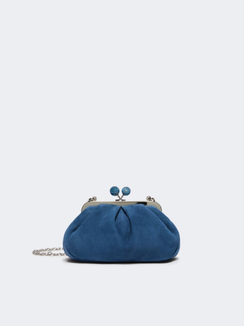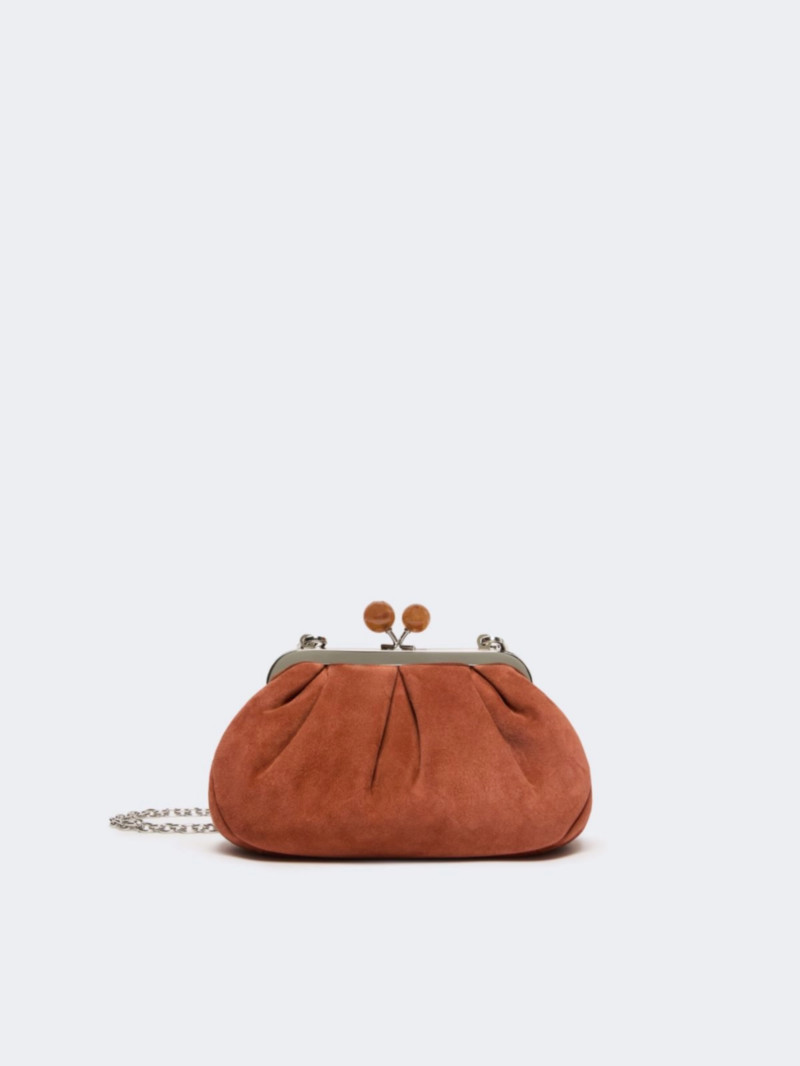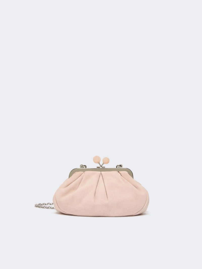 Pasticcino 小號手拿包,柔軟麂皮材質。 條紋內襯,飾有個人化標籤。 可拆式鏈條肩帶,附皮革肩墊。 金屬搭扣,飾有個性化大理石紋球。