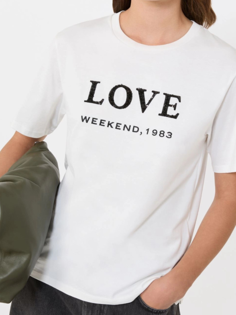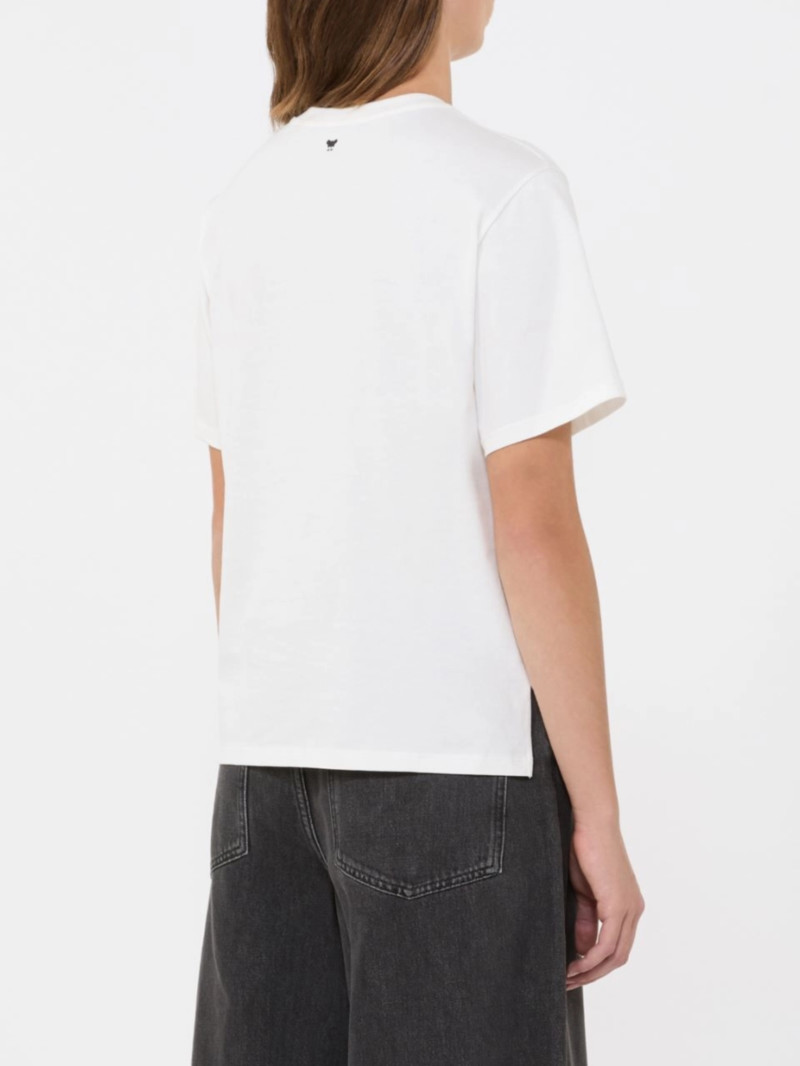 個性化T卹,正面印有圖案並飾有刺繡。 純棉針織T卹,直筒版型,側邊開衩。 羅紋圓領,短袖,後領處繡有小蝴蝶標誌。