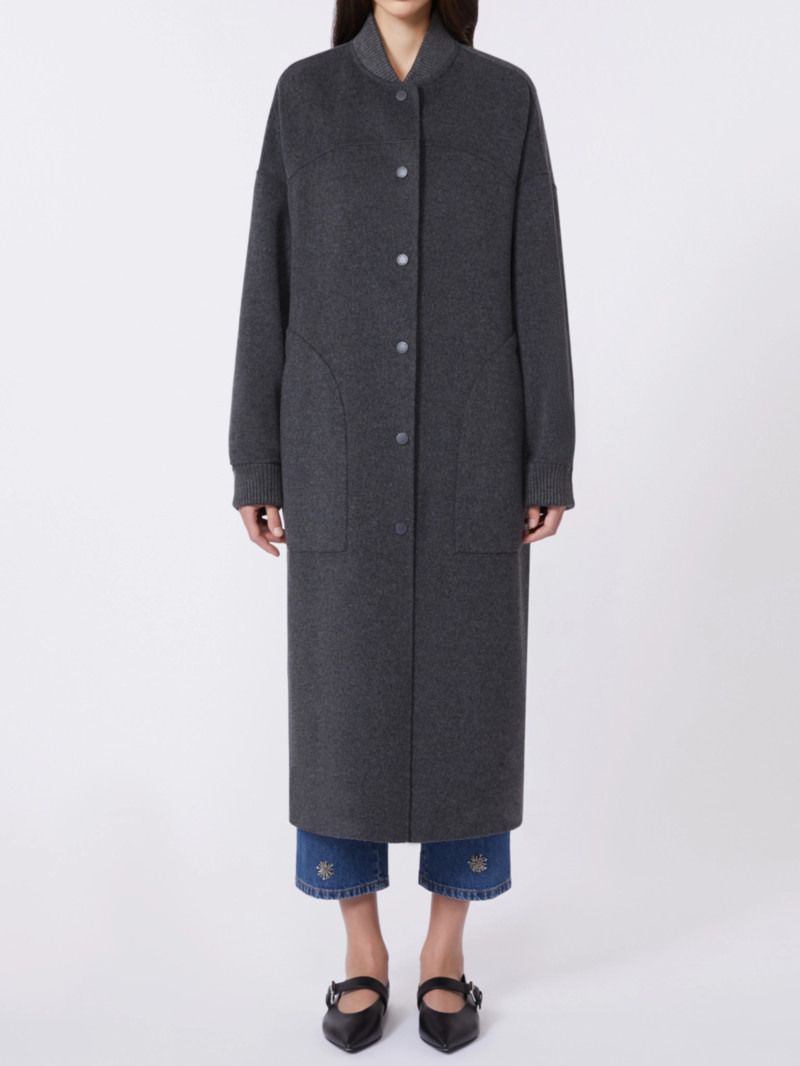 長版大衣,配有飛行員領和羅紋袖口。 手工縫製雙層羊毛混紡大衣,寬鬆版型,落肩長袖。 前襟按扣,兩側配有大號雙貼邊口袋,前後均有軛形拼接細節。