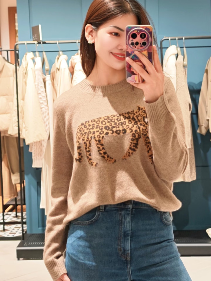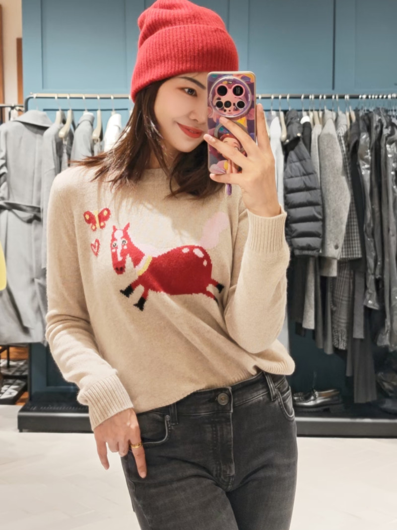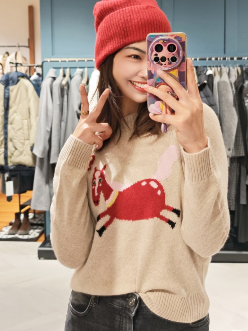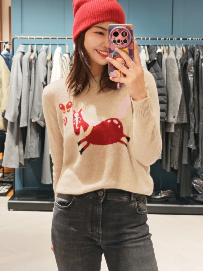 圓領套頭衫,正面飾有系列專屬圖案。 純羊絨衫,柔軟合身,常規長度。 圓領,寬鬆長袖,羅紋袖口。